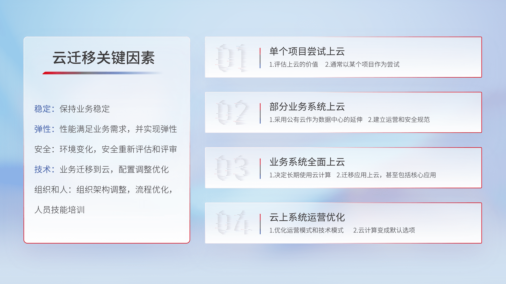 结合实际业务,,,从规划设计、、、、云平台选型、、云原生改造、、数据迁移、、、集成交付,,,,迁移全过程为客户识别最佳上云路径,,做好风险识别管理,,,设计网络架构、、、、身份权限、、安全审计合规、、、、操作审计、、日志审计、、、、监控告警策略、、、多站点容灾设计等,,,对云上基础设施进行整体规划,,,,提升IT治理水平,,,以满足弹性、、、、高可用、、、、高性能的需求。。。