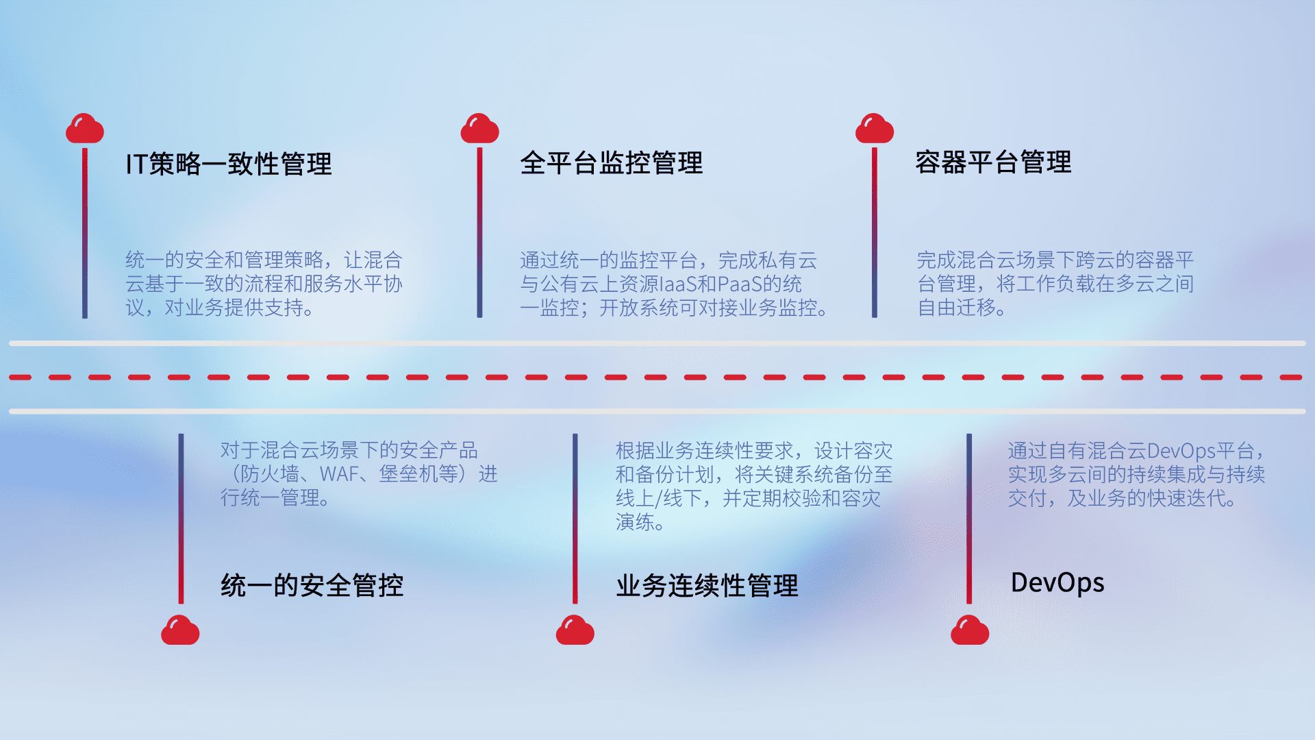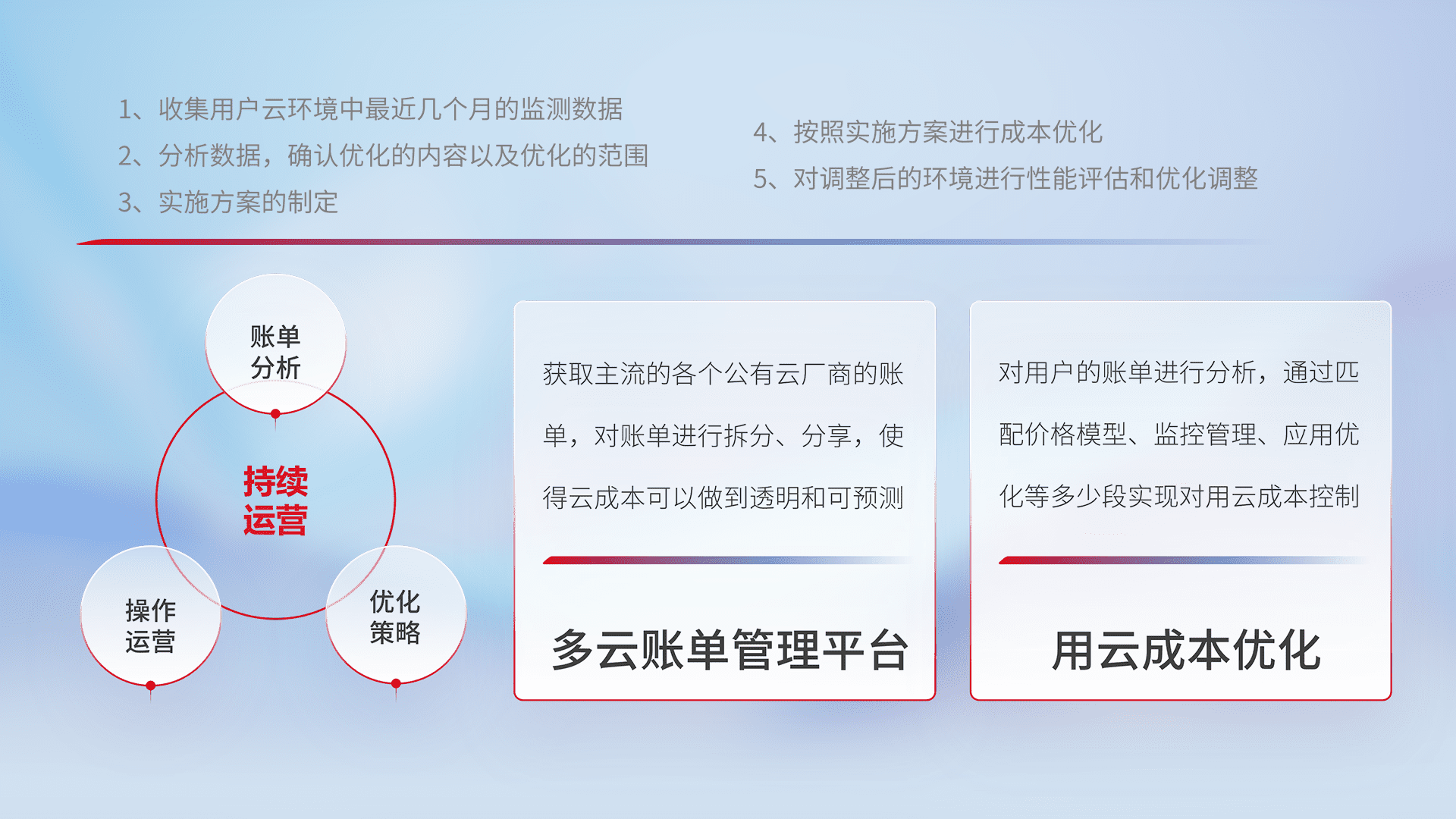 通过多云纳管,,,,以统一的资源数据模型把客户的云资源进行抽象和封装,,,进而实现对多云资源的统一操作,,保障云资源管理的可靠性、、、稳定性与可用性。。。。量身定制化运维内容,,,配置、、、、开发运维、、、、补丁管理、、、备份、、、、监控、、认证和访问管理、、审计和日常巡检等,,保障在用云过程中的可靠度,,稳定度以及高可用率。。