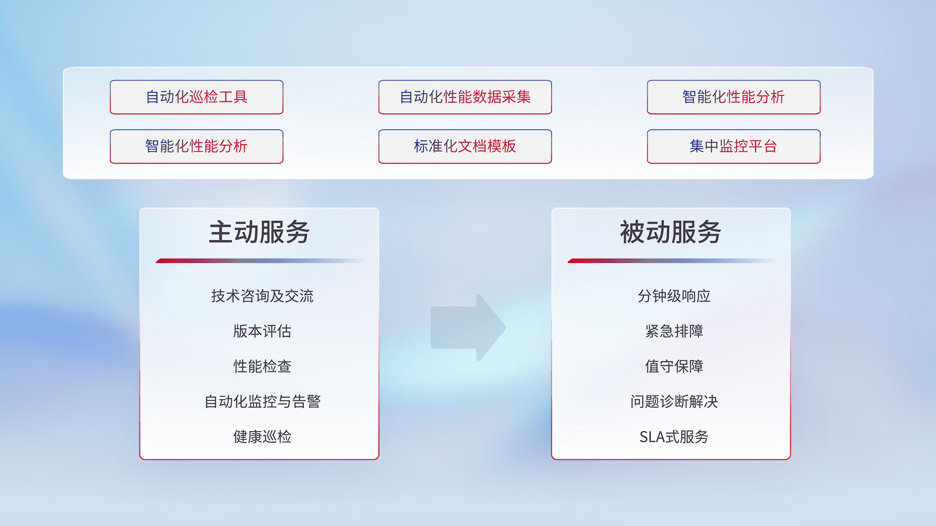 智能化工具和标准化文档,,保障服务质量,,,提供主动服务(包含技术咨询、、版本评估、、、性能检查、、、、自动化监控与告警、、、健康巡检)和被动服务包含(分钟级响应、、紧急排障、、、、值守保障、、、问题诊断解决、、、SLA服务)。。。